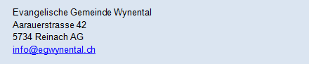 Falls Sie auf elektronischem Weg regelmässig über die Veranstaltungen der Evangelischen Gemeinde Wynental informiert werden möchten, dann tragen Sie Ihre E-Mail-Adresse in das untenstehende Formular ein. Sie werden anschliessend per E-Mail eine Bestätigung erhalten (Datenschutzerklärung).