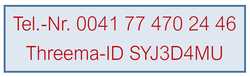 Die untenstehende Nummer in der Kontaktliste deines Smart-phones speichern (ansonsten können später die Nachrichten, die über eine Broadcast-Liste versendet werden, nicht empfangen werden). Zur Anmeldung eine Mitteilung mit Vorname, Name und Wohnort (oder, falls bevorzugt, nur mit Vorname bzw. anonym) sowie der gewünschten Sprache und dem Vermerk "Anmeldung" an die unten genannte Nummer oder Threema-ID senden.
